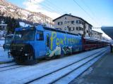 Der Zug nach Preda (und weiter nach Chur) wird von einer Ge 4/4 III gezogen; dahinter der doppelte Jumbo-Speisewagen, der reguläre Zugteil, Gepäckwagen und am Schluss ein